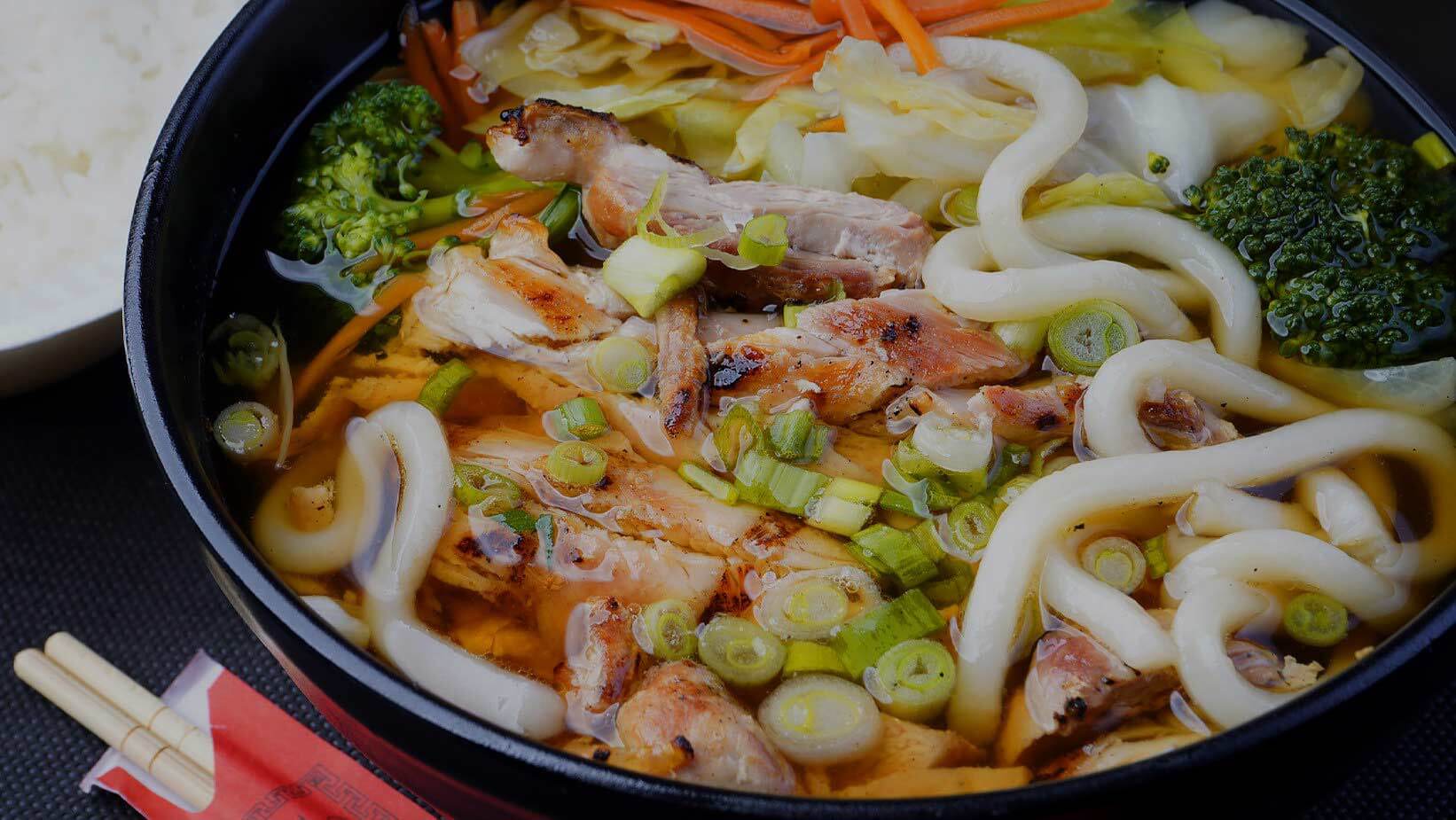 Orange chicken, egg, noodle, broccoli wok’d in homemade sauce sweet-and-sour sauce, black sesame on top